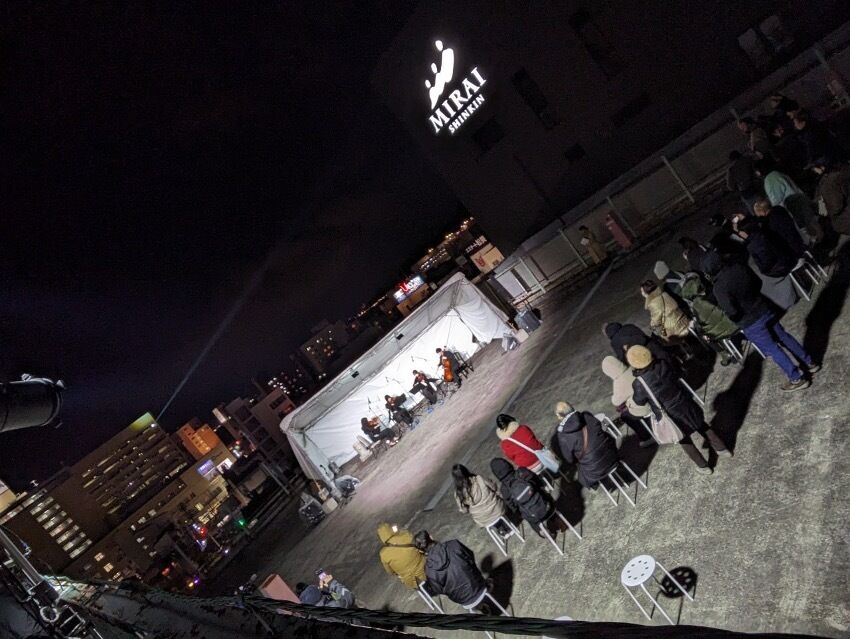 At the "ALTERNATIVE-STATE: The Concert that Bridges Beppu and the Future," we performed the background music of Seiichi Saitō-san's work, "JIKU." It depicts the axis of Beppu in the sky above it with rays of light and the performance took place on the rooftop of a building with this beautiful work in the background!