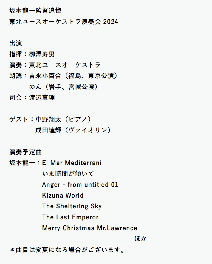 クラシックの交響曲をメインで演奏する過去の演奏会とは違い、今回はオール坂本龍一プログラムの演奏会となります。