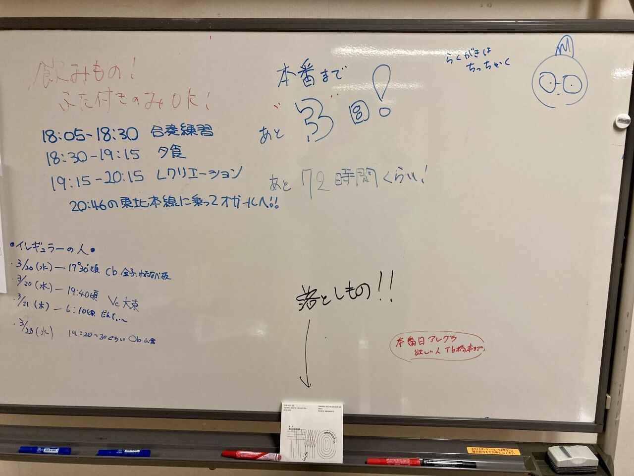 東北ユースオーケストラの本番直前合宿では恒例のホワイトボードに手書きカウントダウンも開始。
