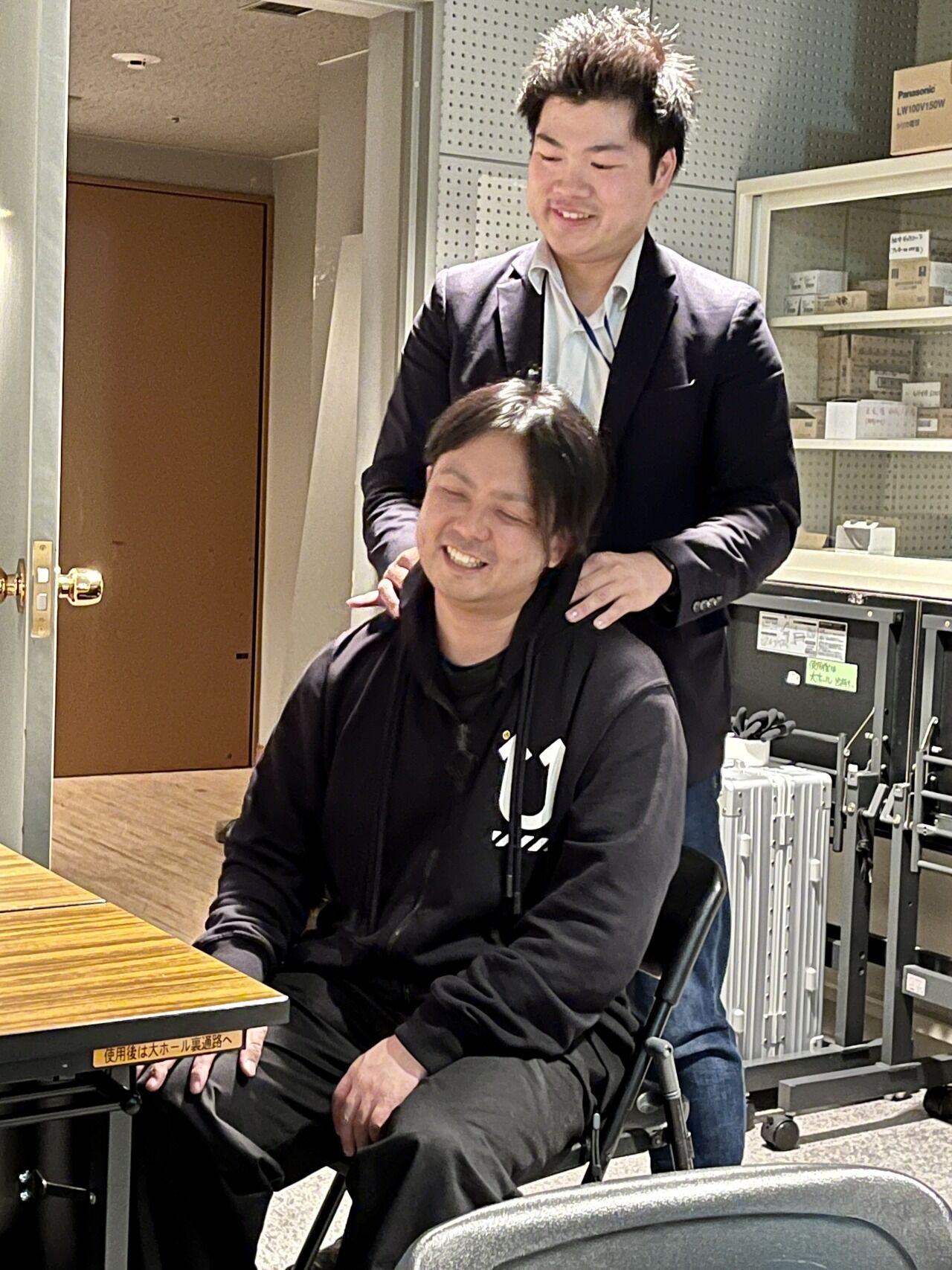 今年TYO直前合宿初参加の小島さんを肩揉みする姿は、学生時代に理学療法を習ったという本格的な施術です。