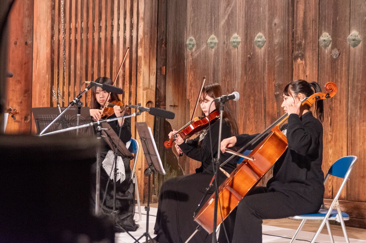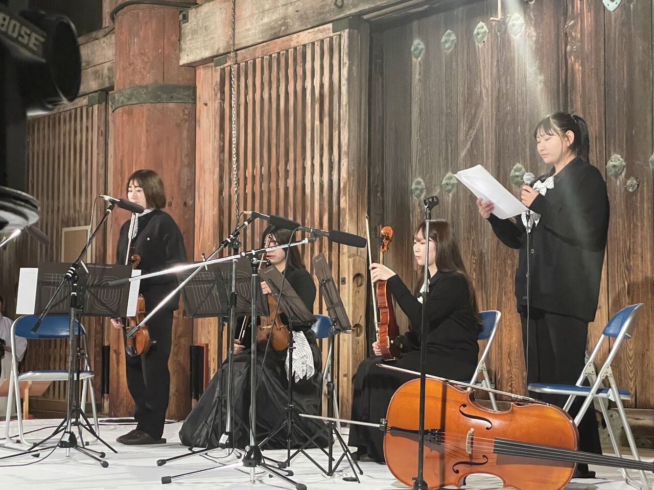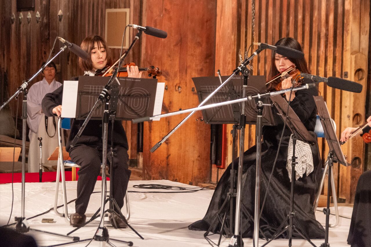 お堂の中に弦楽の繊細なハーモニーが静やかに響き渡り、この「Aqua」の演奏には思わず涙が出たと僧侶の方々や参列のお客さまから言っていただけました。