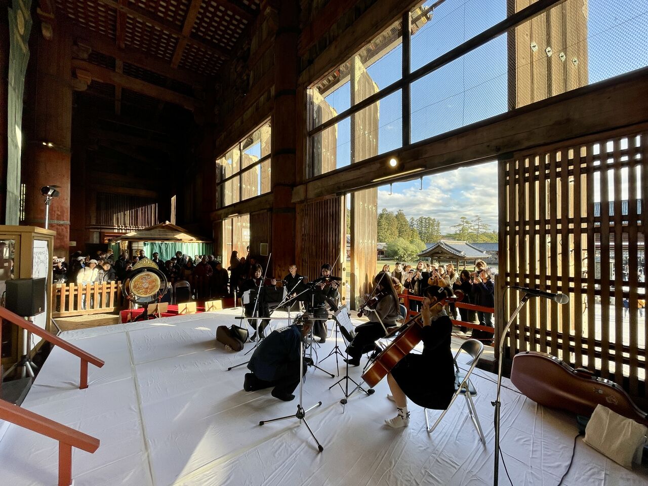 折しも開式とともに降り出した雨が大仏殿に降る音と4人の合奏で、今ここにしかない『戦メリ』の響きが立ち上がっていきました。