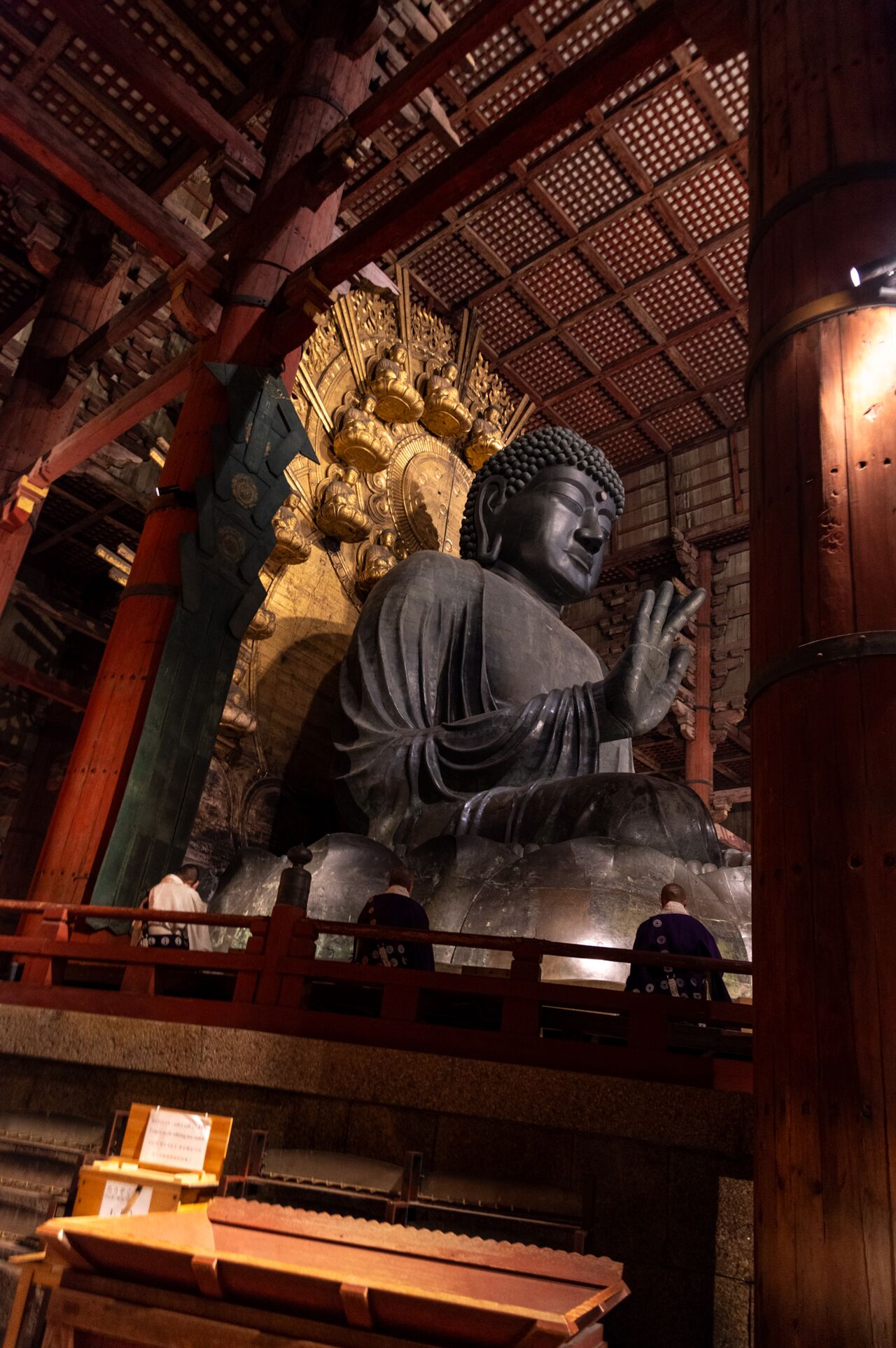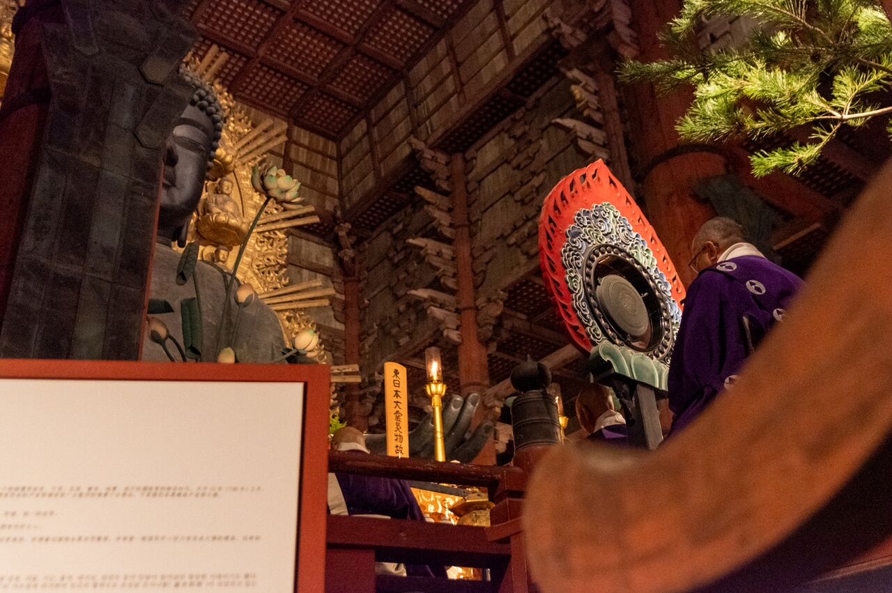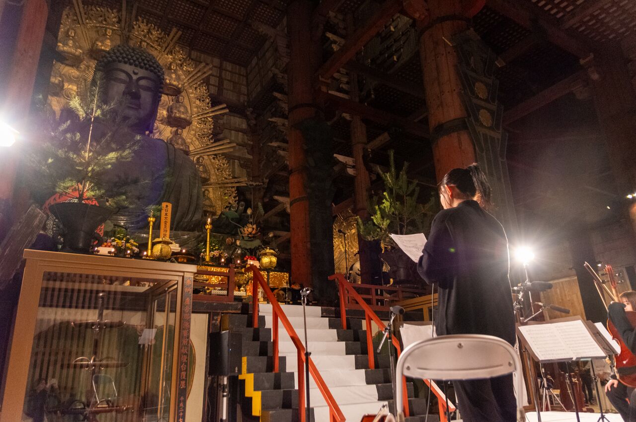 大仏様の台座でお務めをされていた森本公穣さんから、さらなる合奏の音の情報をいただきました。「ちょうど演奏が終わったタイミングで、遠くから鐘の音が聞こえたかと思います。あの音は東大寺の大鐘で、奈良時代に造られたものです。毎日20時に撞いていますが、法要が少し早く始まったことから、皆さんは奈良時代の音ともセッションされたことになりました🎼」