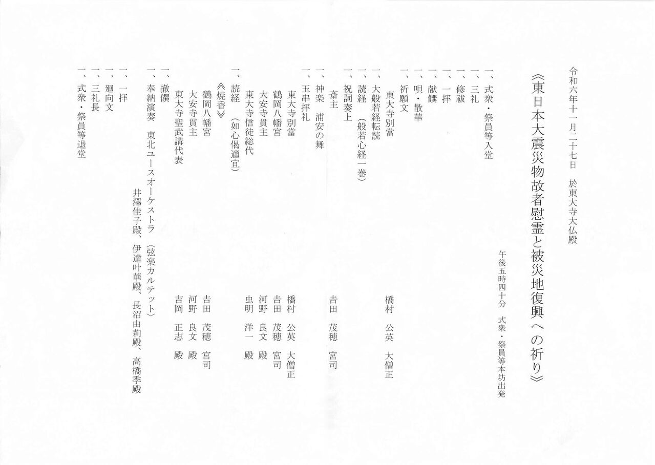 大仏様(盧舎那仏)の御前にて演奏できるとはなかなか得難い光栄なことです。311以来、毎年両社寺の主催で続けられているという「東日本大震災の犠牲者への慰霊と復興への祈り」の式次第は次のようなものでした。