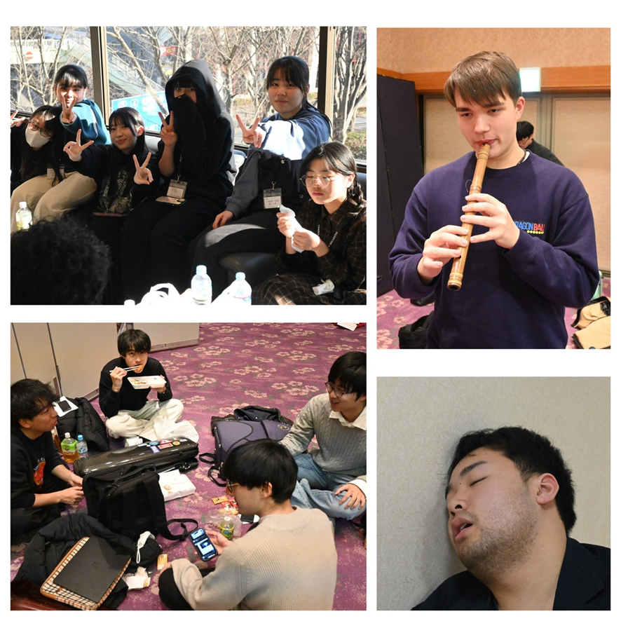 お友達と仲良くご飯を食べるだけではなく、仮眠をとる団員もいれば、自分のパートの楽器ではない楽器を吹く団員もいます。