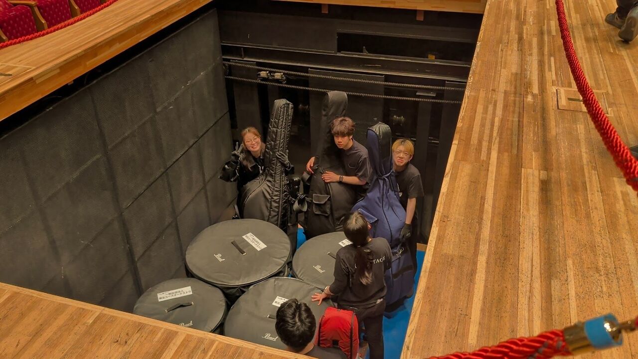 演奏会当日、団員数名は早朝から会場入りしました。舞台裏を支える「仕込み隊」として、楽器の搬入やセッティングに奔走。巨大な搬入用エレベーターに初めて乗ることができた団員も多く、現場はパッと明るい笑顔に包まれました。